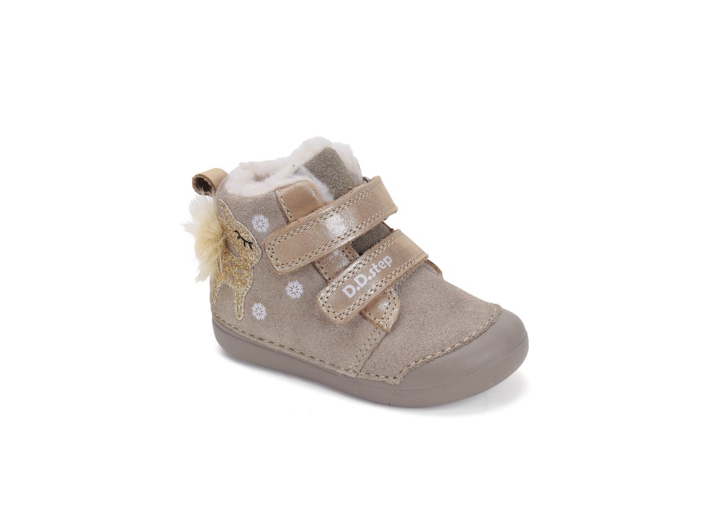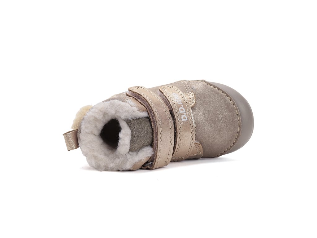 Detská zimná kožená obuv, mäkká-flexibilná podrážka pre pohodlnú chôdzu a praktické zapínanie na suchý zips. Obuv je celokožená s anatomicky tvarovanou stielkou zateplená kožušinou aby pre deti bola maximálne pohodlná a je vyberateľná. Podrážka je lepená a aj šitá najmodernejšou 3D technológiou. Obuv D.D.Step je odľahčená, ohybná a pri prstoch širšia ako pri bare foot obuvi.