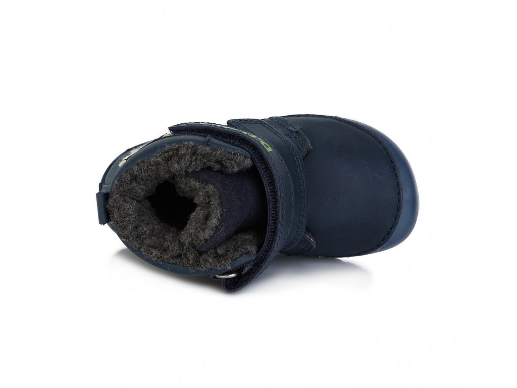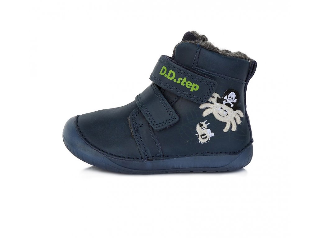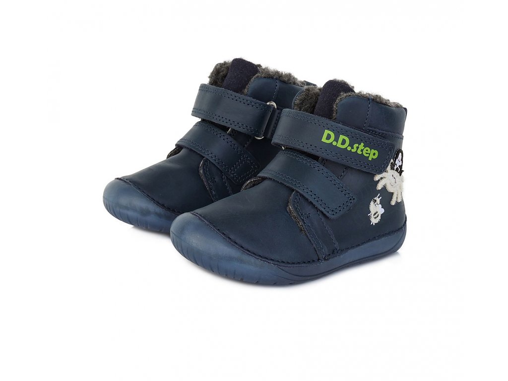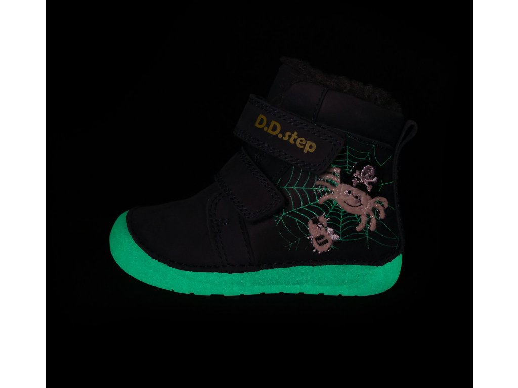 Detská zimná, kožená BARE FOOT obuv, mäkká-flexibilná podrážka s fluorescenčným efektom(svieti v tme), praktické zapínanie na suchý zips. Obuv je celokožená so stielkou zateplenou s kožušinou aby pre deti bola maximálne pohodlná a je vyberateľná. Podrážka je lepená a aj šitá najmodernejšou 3D technológiou. Obuv D.D.Step je odľahčená, ohybná a pri prstoch širšia. Dľžky stielok: