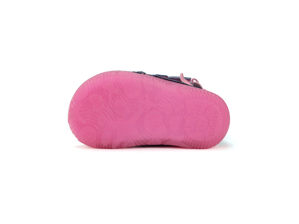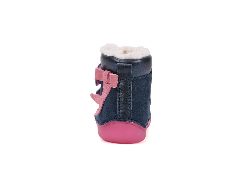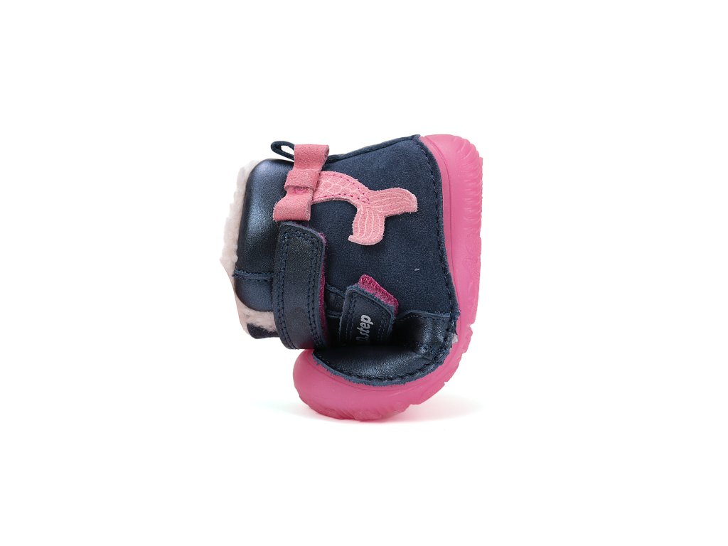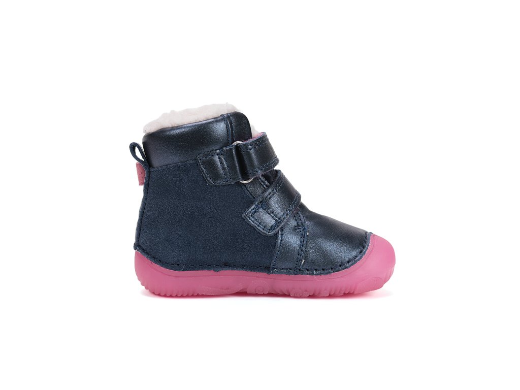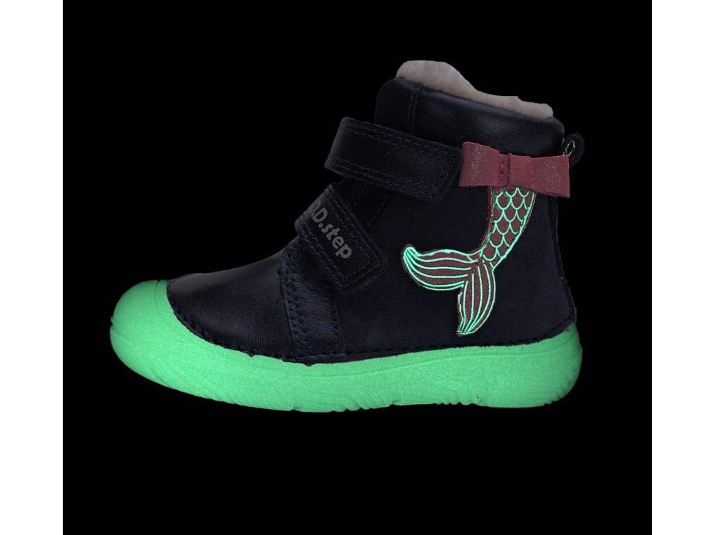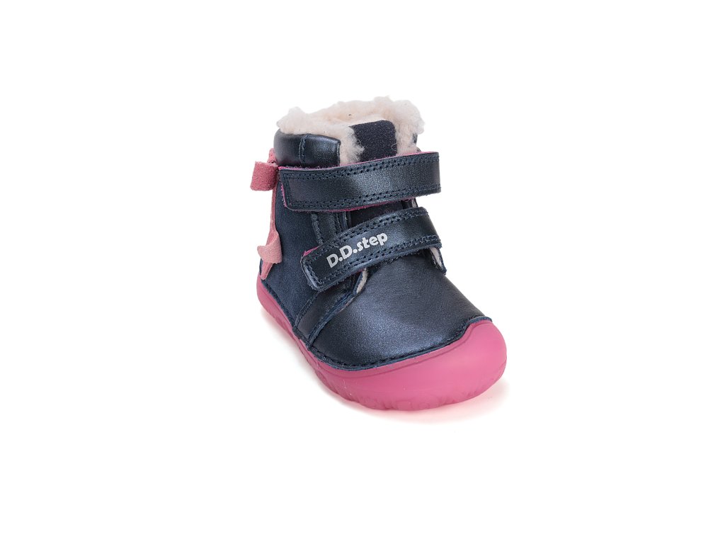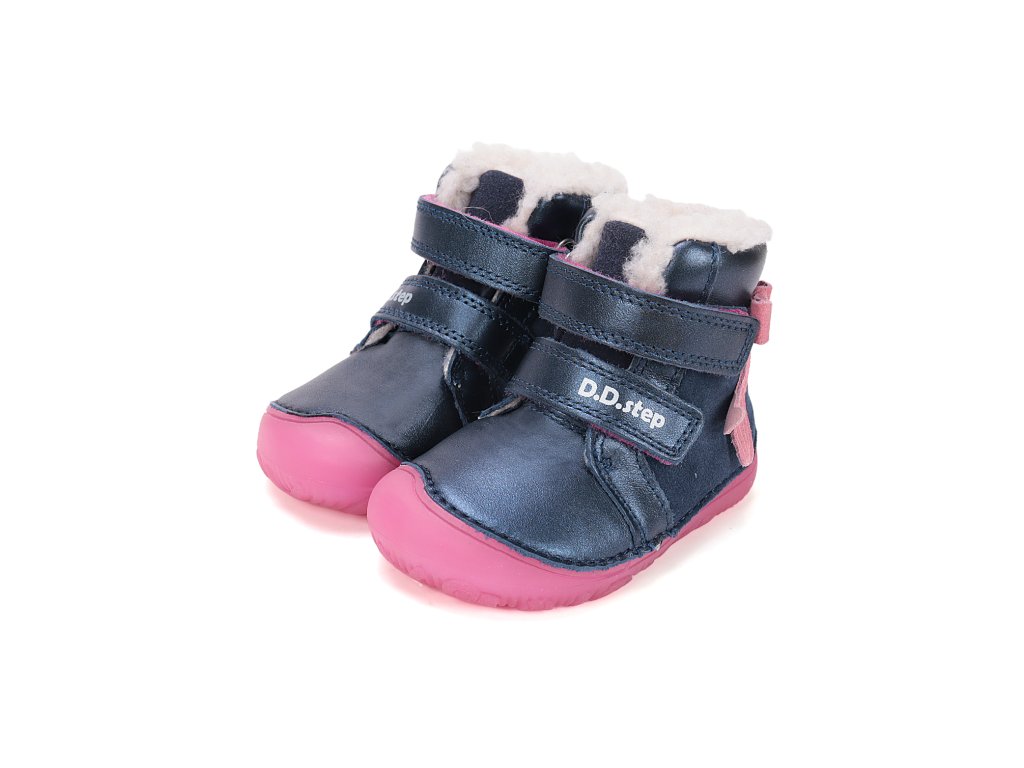 Detská zimná, kožená BARE FOOT obuv, mäkká-flexibilná podrážka, praktické zapínanie na suchý zips. Obuv je celokožená, zateplená kožušinou aby pre deti bola maximálne pohodlná, stielka je vyberateľná. Podrážka je lepená a aj šitá najmodernejšou 3D technológiou. Obuv D.D.Step je odľahčená, ohybná a pri prstoch širšia. Podrážka je fluorescenčná, v tme svieti. Dĺžky stielok :