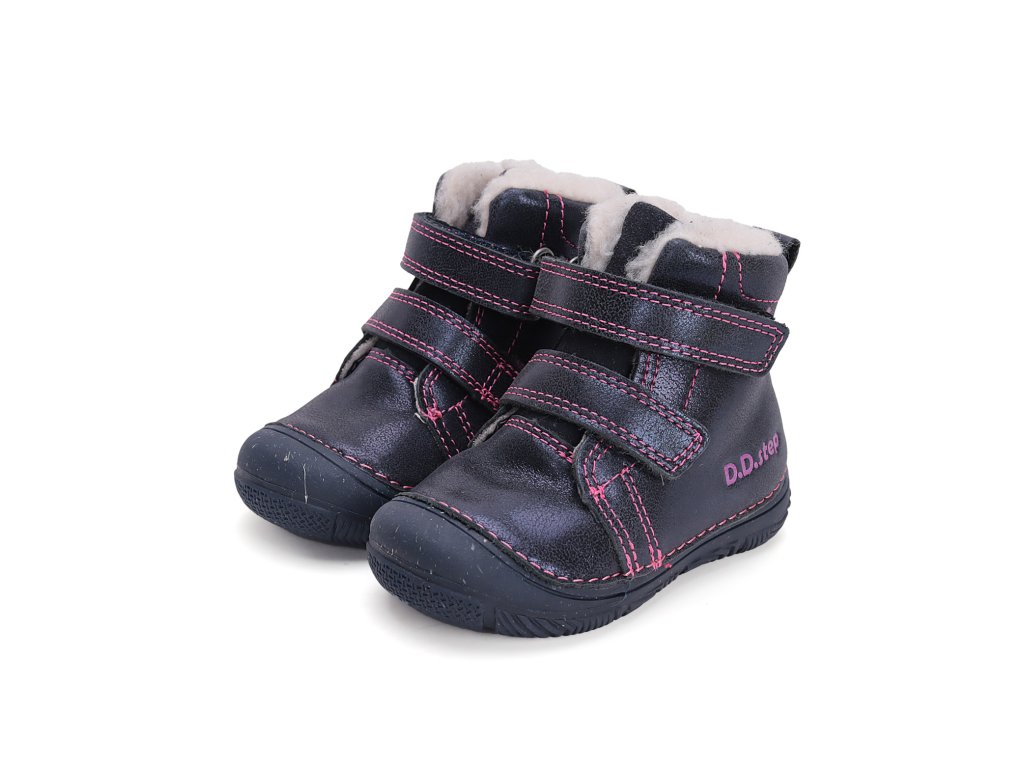 Detská zimná kožená obuv, mäkká-flexibilná podrážka pre pohodlnú chôdzu a praktické zapínanie na suchý zips. Obuv je celokožená (zvršok z odolnej lícovej kože) s anatomicky tvarovanou stielkou, zateplená kožušinou aby pre deti bola maximálne pohodlná a je vyberateľná. Podrážka je lepená a aj šitá najmodernejšou 3D technológiou. Obuv D.D.Step je odľahčená, ohybná a pri prstoch širšia.