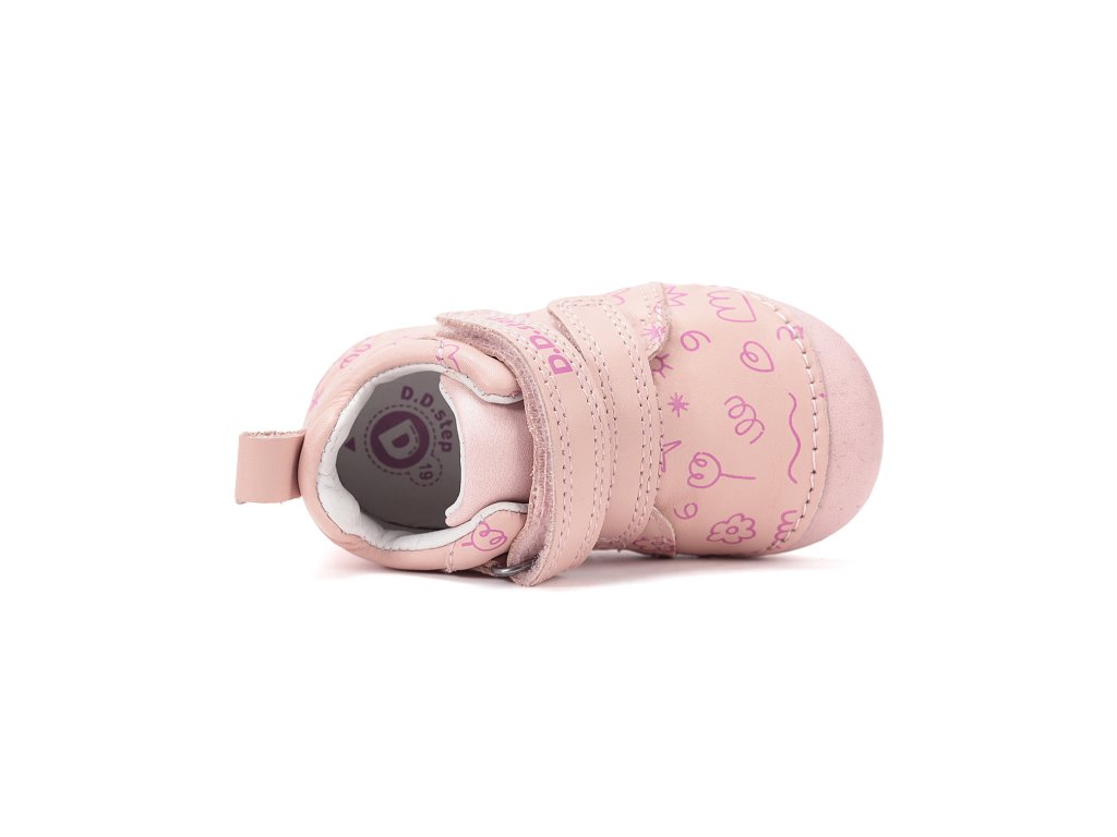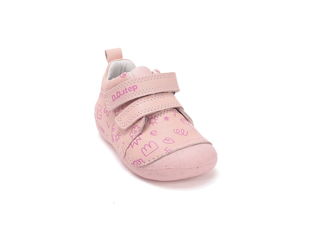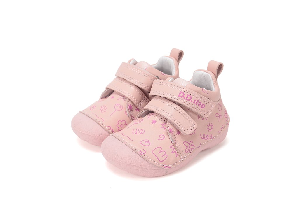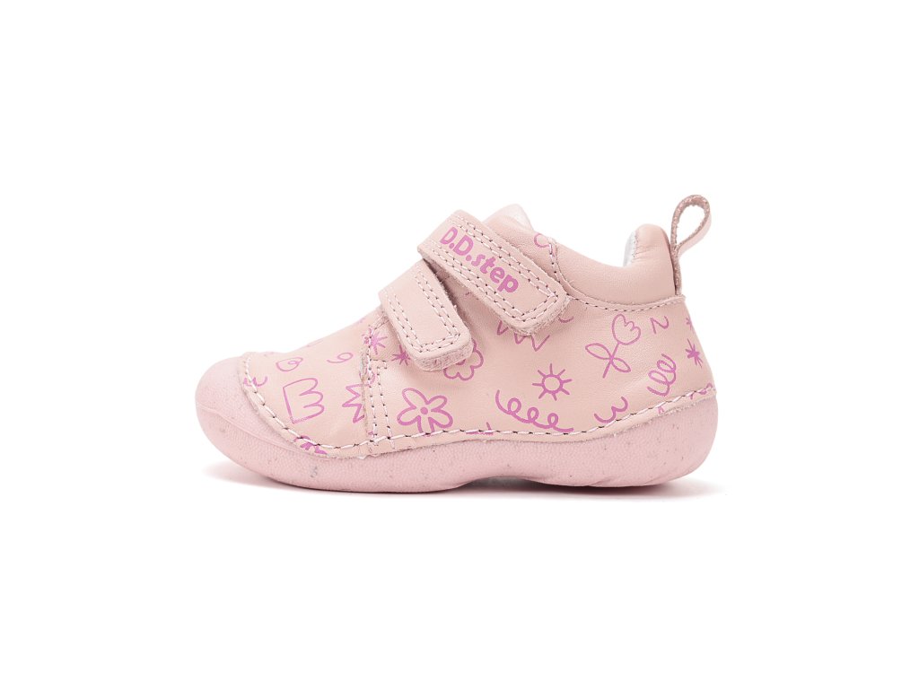Detská kožená obuv-celorok, mäkká-flexibilná podrážka pre pohodlnú chôdzu a praktické zapínanie na suchý zips. Obuv je celokožená s koženou anatomicky tvarovanou stielkou z mäkčenej kože najvyššej kvality aby bola pre deti maximálne pohodlná a je vyberateľná. Podrážka je lepená a aj šitá najmodernejšou 3D technológiou. Obuv je odľahčená, ohybná a pri prstoch širšia ako pri bare foot obuvi, vhodné aj ako obuv na prvé kroky. Novinkou pri D.D.Step obuvi je podrážka so zmesou trstiny (vidieť ako jemné zrná vo farbe podrážky) pre ekologickejšiu výrobu a rozložiteľnosť pri recyklácií.