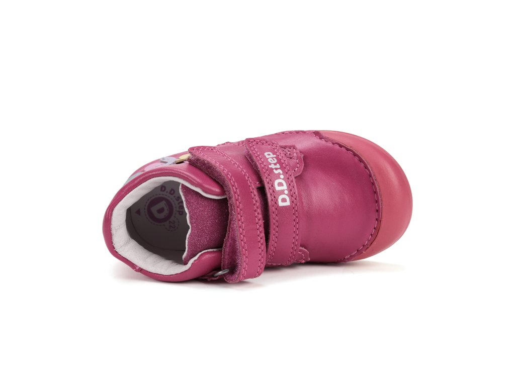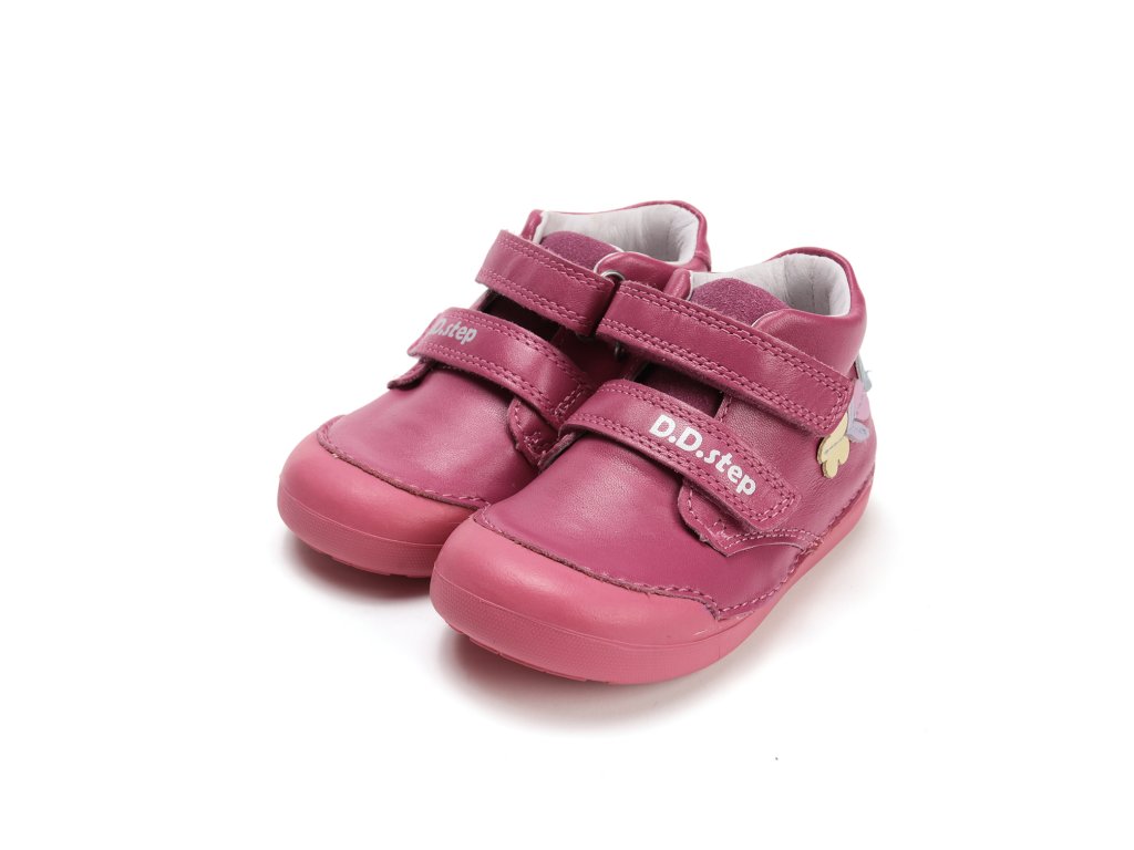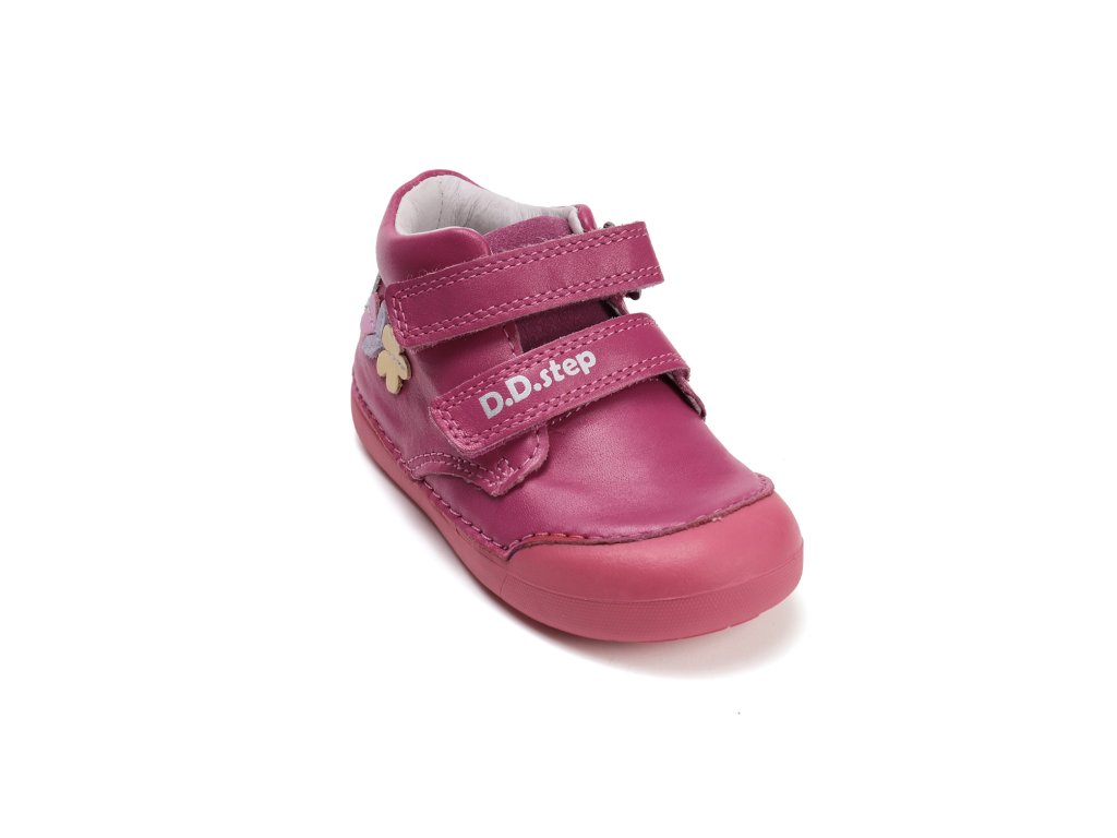 Detská kožená obuv-celorok, mäkká-flexibilná podrážka pre pohodlnú chôdzu a praktické zapínanie na suchý zips. Obuv je celokožená s koženou anatomicky tvarovanou stielkou z mäkčenej kože najvyššej kvality aby bola pre deti maximálne pohodlná a je vyberateľná. Podrážka je lepená a aj šitá najmodernejšou 3D technológiou. Obuv D.D.Step je odľahčená, ohybná a pri prstoch širšia , pri prstoch ohybná - flexi system. Novinkou pri D.D.Step obuvi je podrážka so zmesou trstiny (vidieť ako jemné zrná vo farbe podrážky) pre ekologickejšiu výrobu a rozložiteľnosť pri recyklácií.