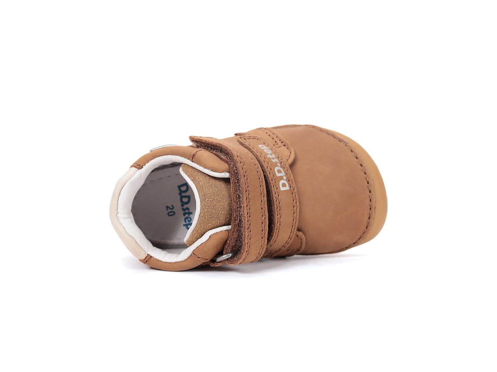 Detská kožená obuv-celorok, mäkká-flexibilná podrážka pre pohodlnú chôdzu a praktické zapínanie na suchý zips. Obuv je celokožená s koženou stielkou z mäkčenej kože najvyššej kvality aby bola pre deti maximálne pohodlná a je vyberateľná. Podrážka je lepená a aj šitá najmodernejšou 3D technológiou. Obuv D.D.Step je odľahčená, ohybná a pri prstoch širšia , bare foot obuv. Novinkou pri D.D.Step obuvi je podrážka so zmesou trstiny (vidieť ako jemné zrná vo farbe podrážky) pre ekologickejšiu výrobu a rozložiteľnosť pri recyklácií.