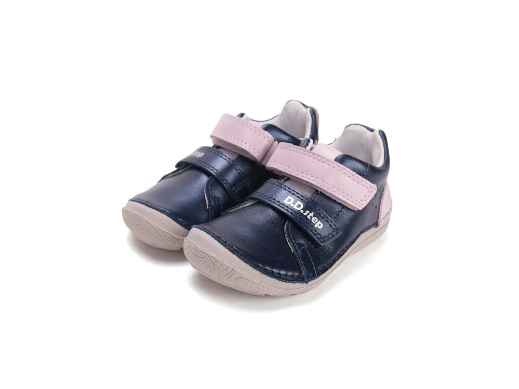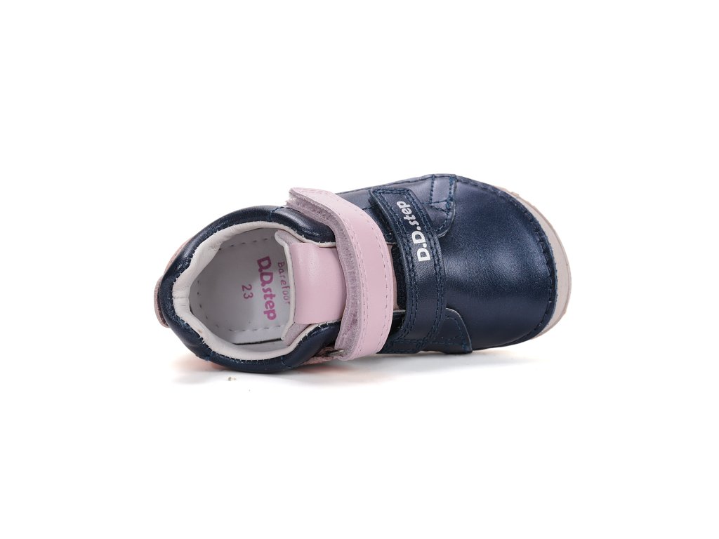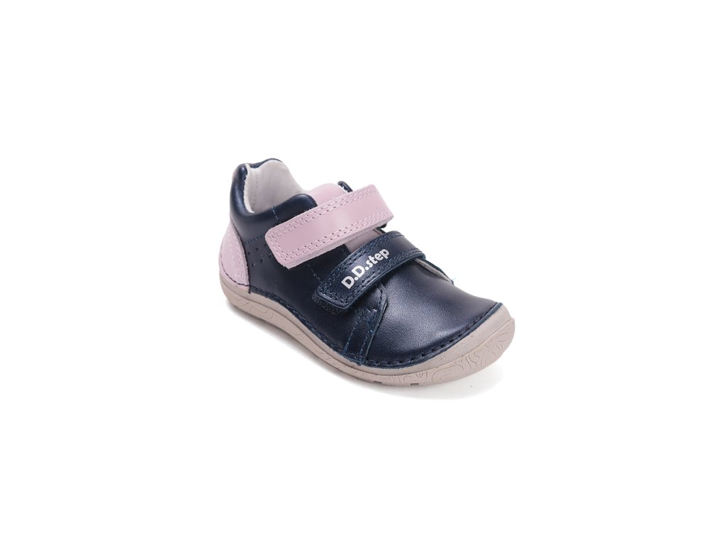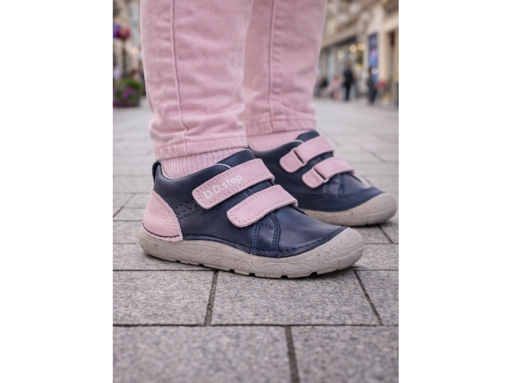 Detská kožená barefoot obuv, mäkká-flexibilná podrážka pre pohodlnú chôdzu a praktické zapínanie na suchý zips. Obuv je celokožená s koženou stielkou z mäkčenej kože najvyššej kvality aby bola pre deti maximálne pohodlná a je vyberateľná. Podrážka je lepená a aj šitá najmodernejšou 3D technológiou. Obuv D.D.Step je odľahčená s ohybnou podrážkou a pri prstoch širšia.