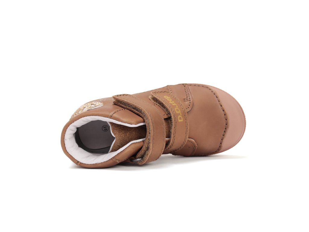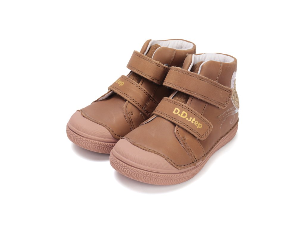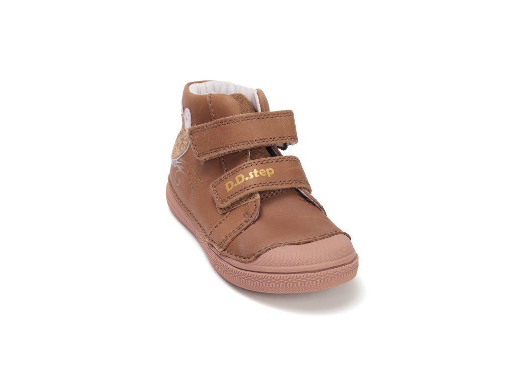 Detská kožená obuv-celorok, mäkká-flexibilná podrážka pre pohodlnú chôdzu a praktické zapínanie na suchý zips. Obuv je celokožená s koženou tvarovanou stielkou z mäkčenej kože najvyššej kvality aby bola pre deti maximálne pohodlná a je vyberateľná. Podrážka je lepená a aj šitá najmodernejšou 3D technológiou. Obuv D.D.Step je odľahčená s ohybnou podrážkou a pri prstoch širšia.