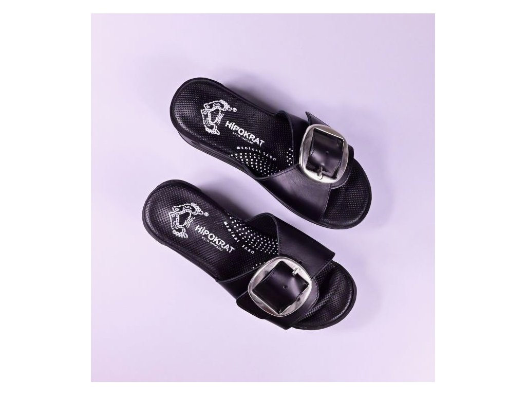 Štýlové dámske celokožené šľapky s mäkkou výstelkou, anatomicky tvarované na podporu klenby, priečnej klenby, prstov a masážnym bodom v päte. Priehlavok je na funkčnú pracku, dá sa nastaviť na ideálnu výšku priehlavku.