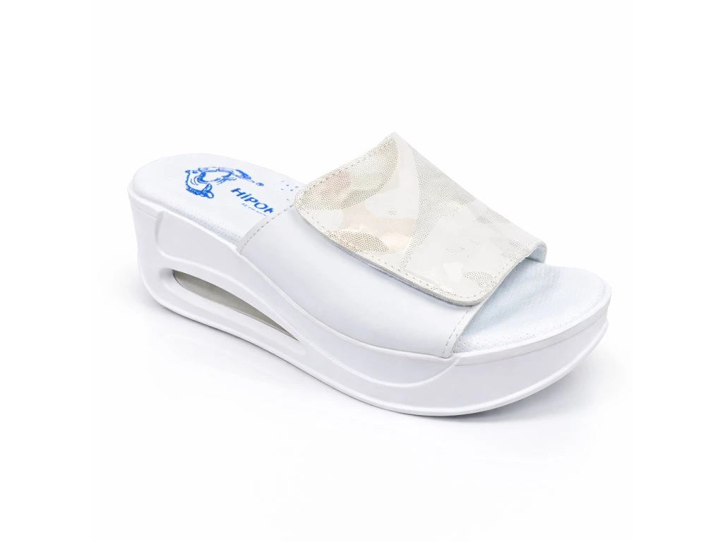 Štýlové dámske celokožené šľapky s mäkkou výstelkou, anatomicky tvarované na podporu klenby, priečnej klenby, prstov a masážnym bodom v päte. Priehlavok je na pevný suchý zips, dá sa nastaviť na ideálnu výšku priehlavku.