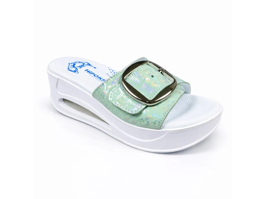 Štýlové dámske celokožené šľapky s mäkkou výstelkou, anatomicky tvarované na podporu klenby, priečnej klenby, prstov a masážnym bodom v päte. Priehlavok je na funkčnú pracku, dá sa nastaviť na ideálnu výšku priehlavku.