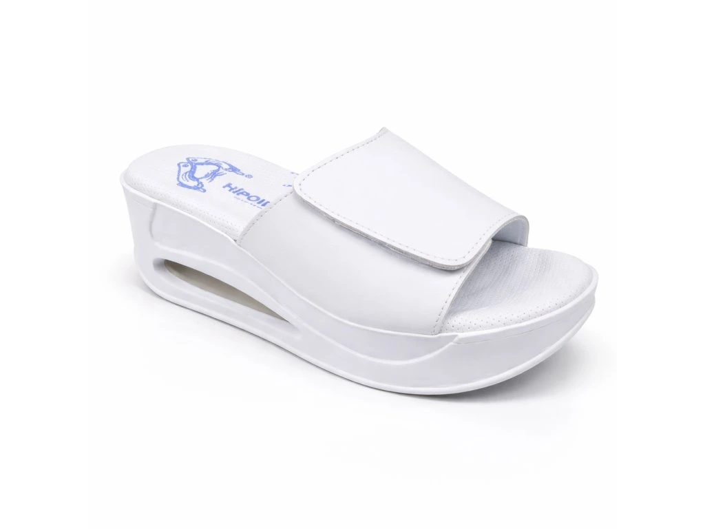 Štýlové dámske celokožené šľapky s mäkkou výstelkou, anatomicky tvarované na podporu klenby, priečnej klenby, prstov a masážnym bodom v päte. Priehlavok je na pevný suchý zips, dá sa nastaviť na ideálnu výšku priehlavku.