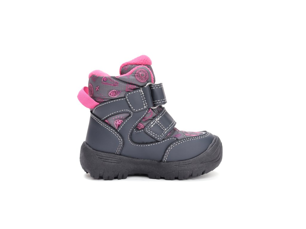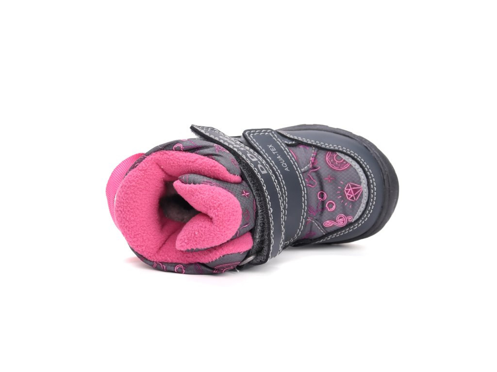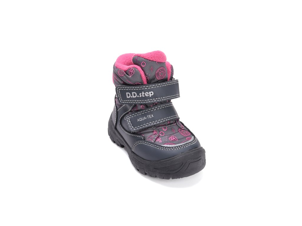 Detská zimná obuv s Aquatex membránou aby bola nepremokavá v štýle snehúl. Je hrubo zateplená kožušinou, zvršok je kombináciou kože a textílie s reflexnou vrstvou, zapínanie na suchý zips. Má hrubšiu protišmykovú podrážku do vlhšieho a chladnejšieho počasia. Je lepená a aj šitá najmodernejšou 3D technológiou. Obuv D.D.Step je odľahčená.
