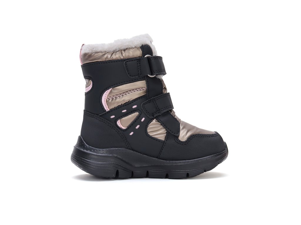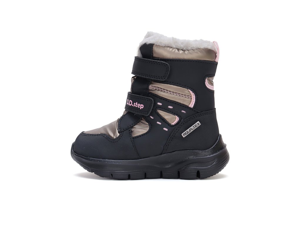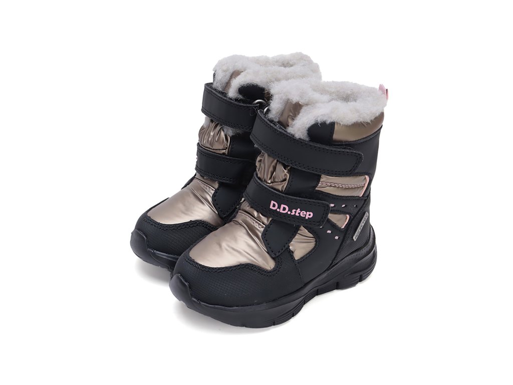 Detská zimná obuv s Aquatex membránou aby bola nepremokavá v štýle snehúl. Je hrubo zateplená kožušinou, zvršok je kombináciou kože a textílie s reflexnou vrstvou, zapínanie na suchý zips. Má hrubšiu protišmykovú podrážku do vlhšieho a chladnejšieho počasia. Je lepená a aj šitá najmodernejšou 3D technológiou. Obuv D.D.Step je odľahčená.