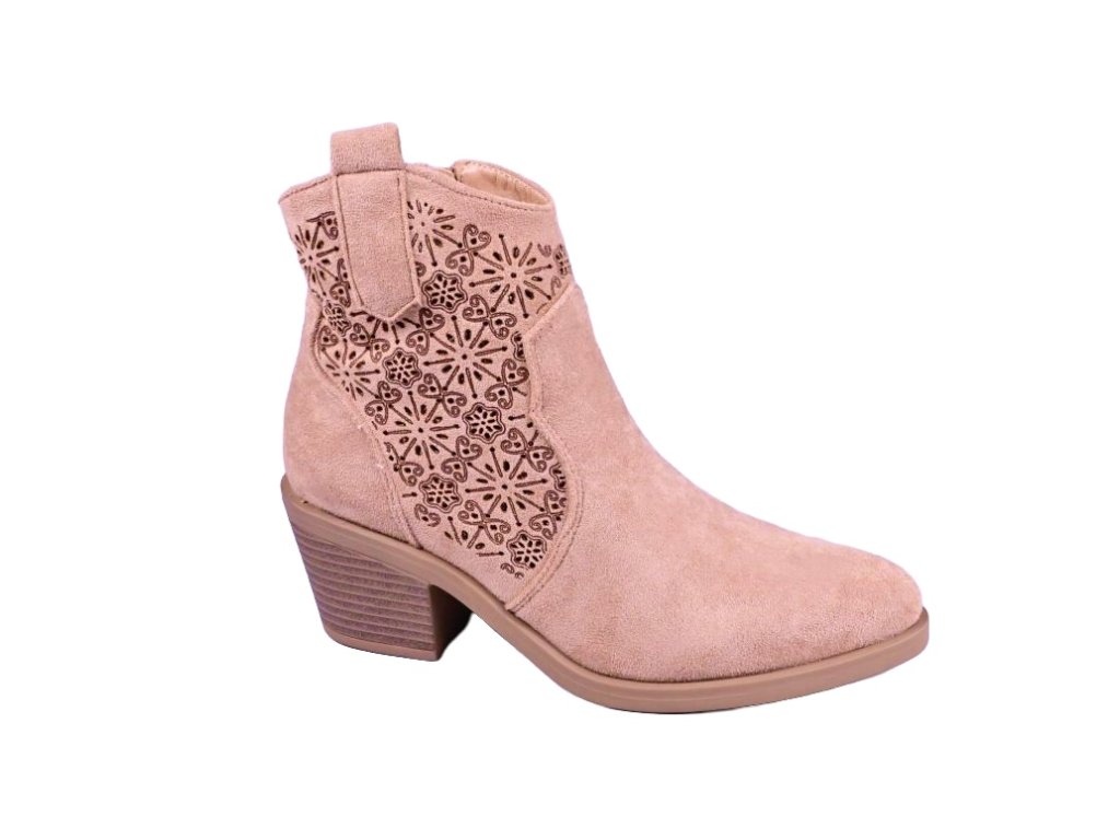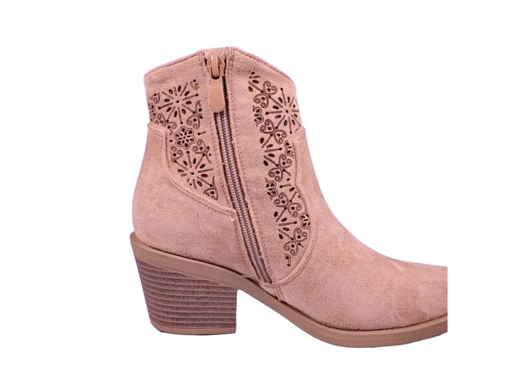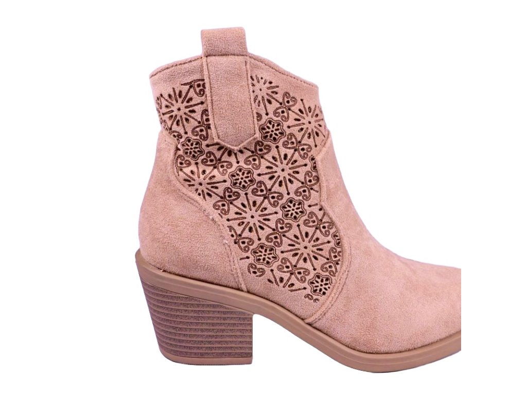 Elegantné a zároveň štýlové dámske kotníkové čižmy vo westernovom štýle z jemného semišu v jemnej béžovej farbe. Vrchný materiál je jemne elastický. Vzor na zvršku je tvorený výrezmi cez ktoré obuv zároveň odvádza teplo od nôh vďaka čomu sú nositeľné aj cez leto.
