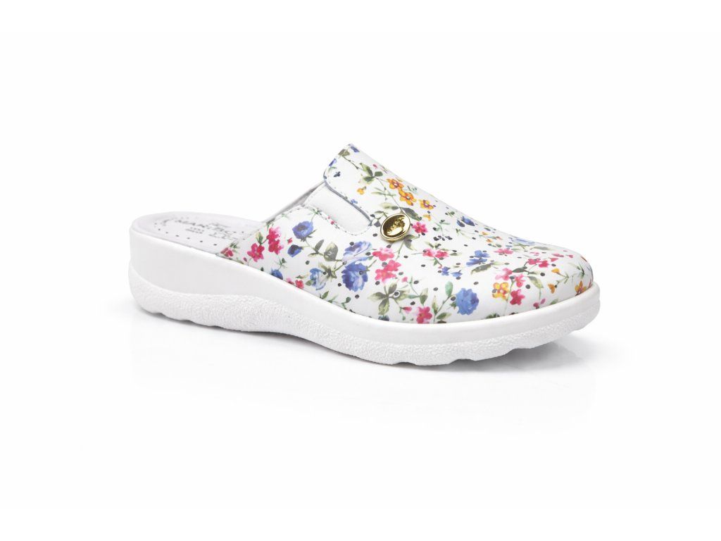 Zdravotné dámske šľapky, celokožené s mäkkou výstelkou, anatomicky tvarované na podporu klenby, s gumičkou v priehlavku na prispôsobenie sa výške priehlavku. Zvršok je perforovaný na odvedenie tepla od nôh. Podrážka je protišmyková.