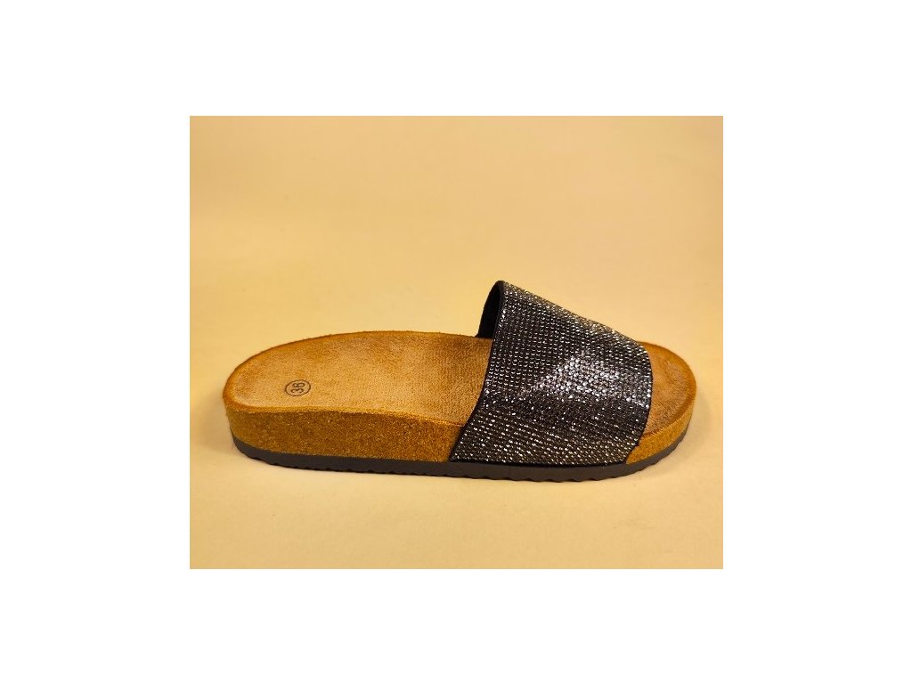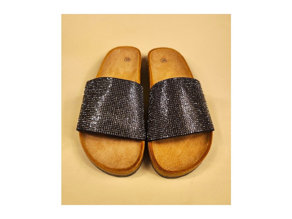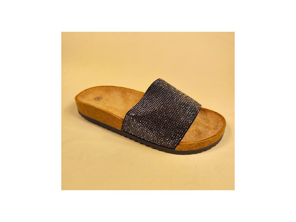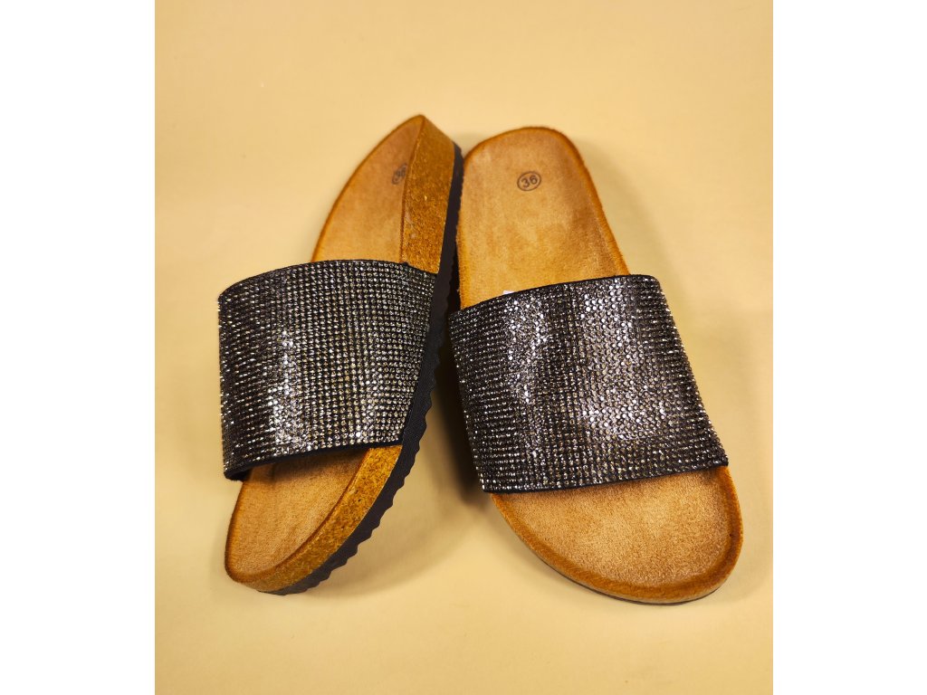 Pohodlné módne dámske šľapky s trblietavou prackou a s korkovým lemom ponúkajú komfort pre Vaše chodidlá vďaka tvarovanej stielke z nešmykľavého textilu a korýtka - okraja obuvi ktorá drží nohu na správnom mieste.
