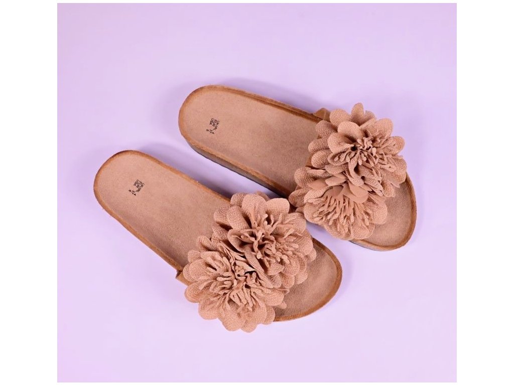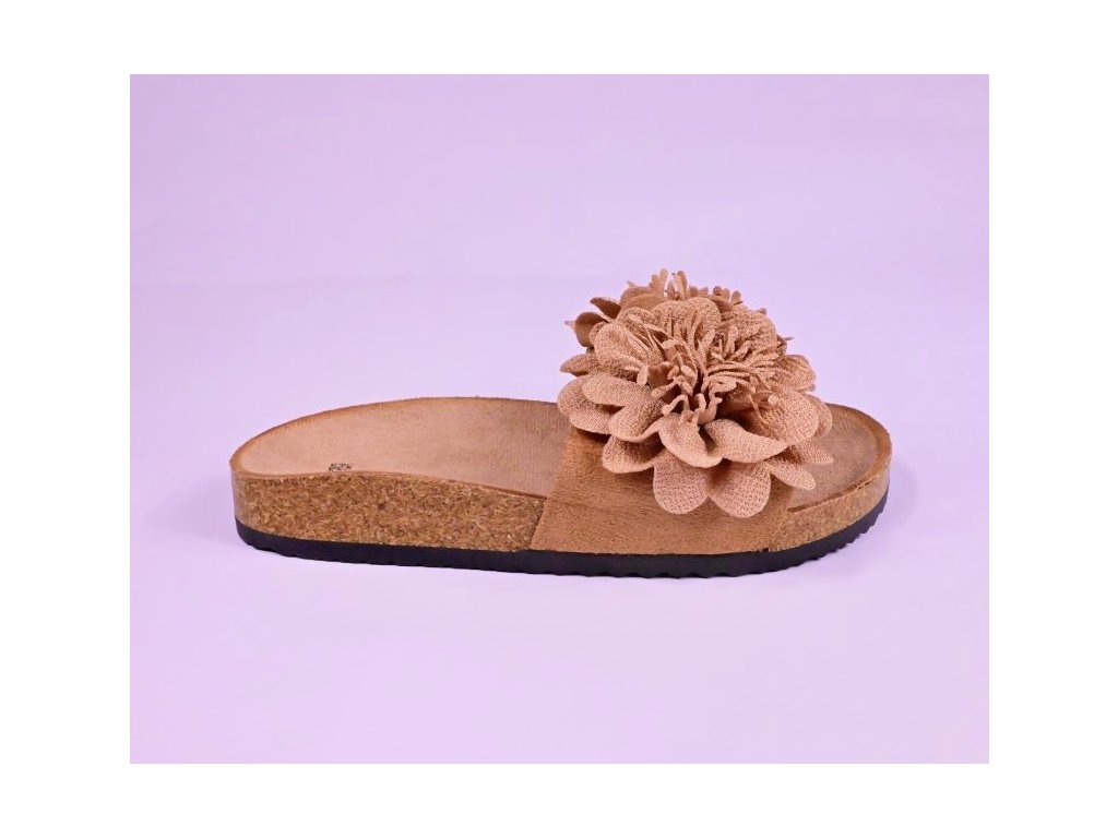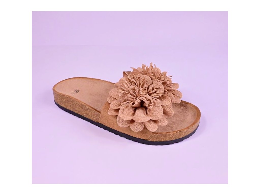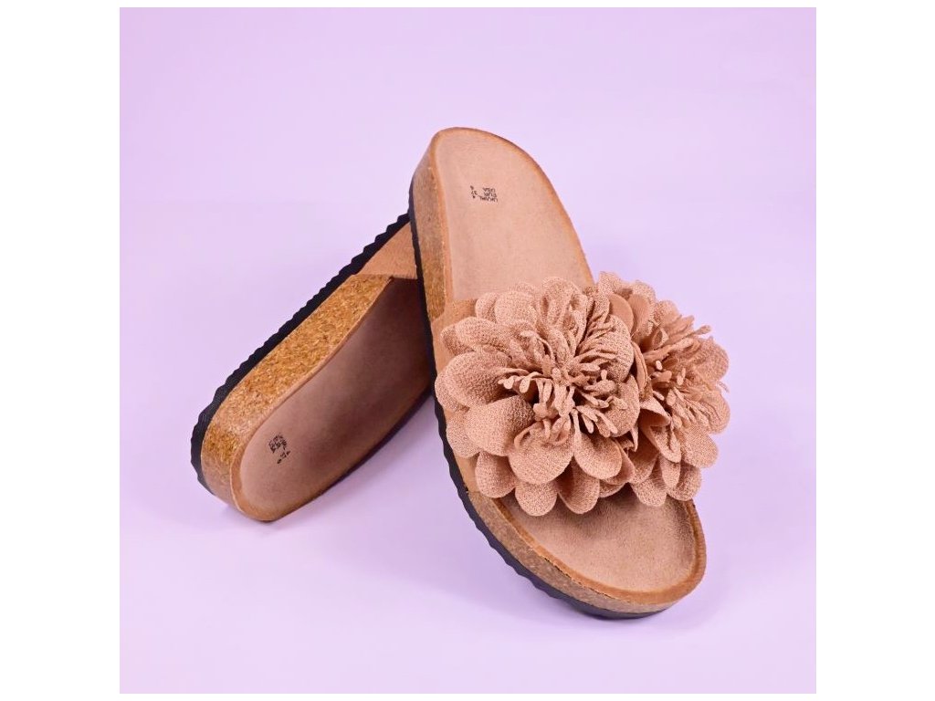 Pohodlné módne dámske šľapky s prackou zdobenou kvietkom a s korkovým lemom. Ponúkajú komfort pre Vaše chodidlá vďaka tvarovanej stielke z nešmykľavého textilu a korýtka - okraja obuvi ktorá drží nohu na správnom mieste.