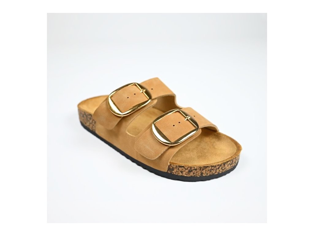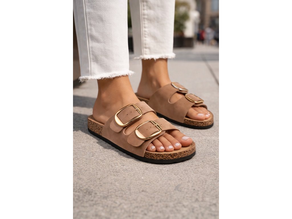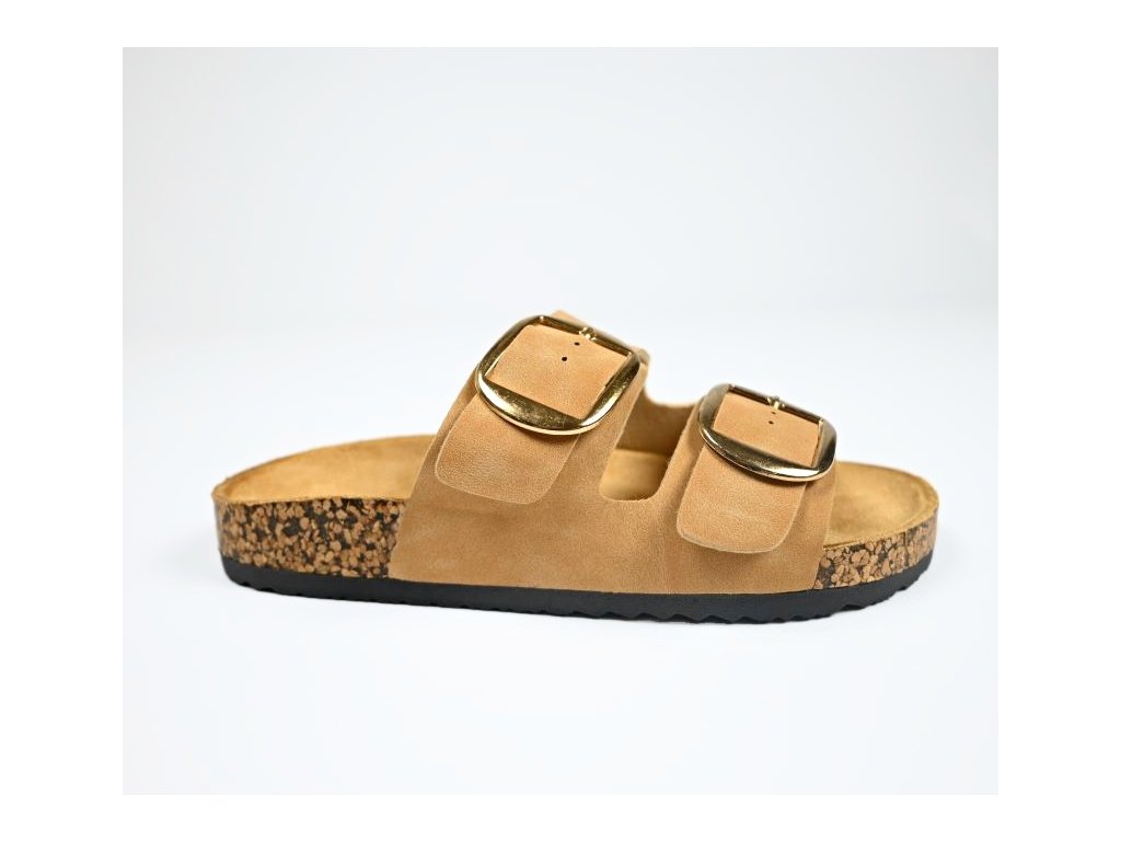Pohodlné dámske šľapky s korkovým lemom so zapínaním na dve funkčné pracky ktoré viete nastaviť na ideálnu výšku priehlavku. Ponúkajú komfort pre Vaše chodidlá vďaka tvarovanej stielke z nešmykľavého textilu a korýtka - okraja obuvi ktorá drží nohu na správnom mieste.
