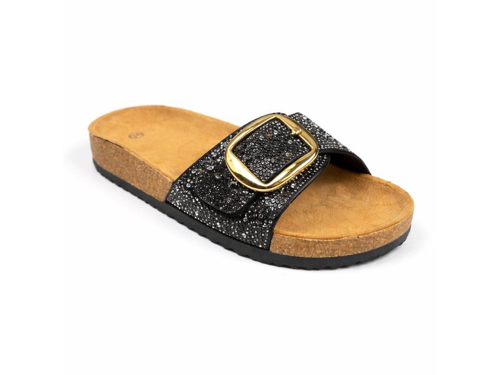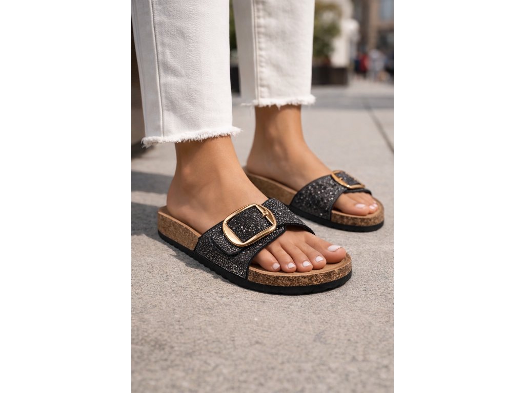 Pohodlné módne dámske šľapky s trblietavou prackou a s korkovým lemom. Ponúkajú komfort pre Vaše chodidlá vďaka tvarovanej stielke z nešmykľavého textilu a korýtka - okraja obuvi ktorá drží nohu na správnom mieste.