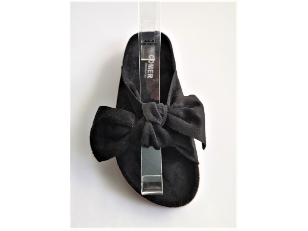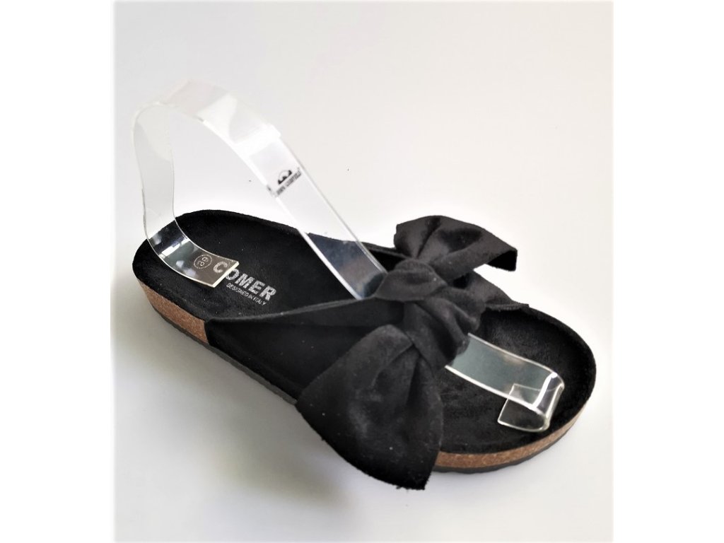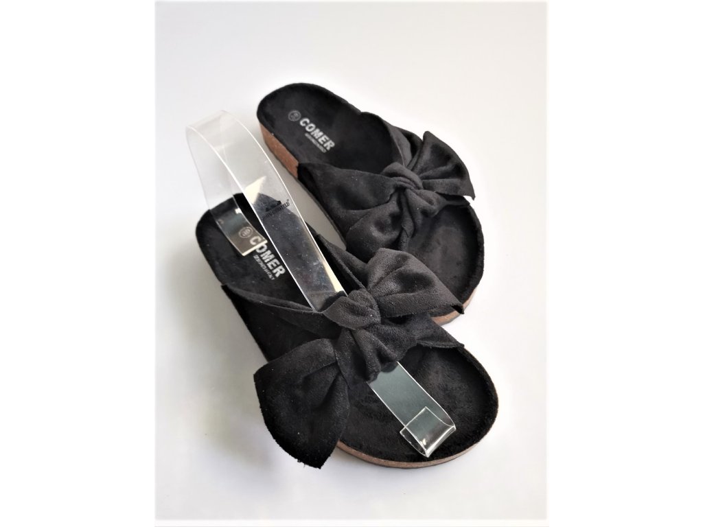 Pohodlné módne dámske šľapky s mašľou na priehlavku z látky, ktorá sa prispôsobí priehlavku a s ozdobným korkovým lemom. Stielka je ergonomicky tvarovaná ako pri ortopedickej obuvi, potiahnutá látkou.